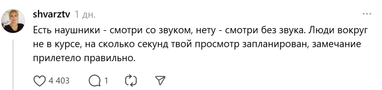 Такой пост появился в соцсети Threads. И он вызвал бурное обсуждение пользователей. Оказывается, когда в общественном месте кто-то смотрит видео со зуком, это не просто раздражает, а бесит многих. Самый популярный комментарий набрал почти 4,5 тысячи лайков.