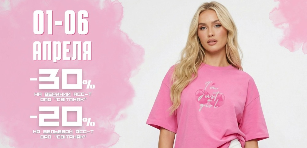 На изделия ОАО «Свiтанак» из бельевого мужского, женского и детского ассортимента (ясельного, для мальчика, для девочки) — скидка 20%.