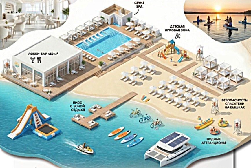 Концепция предусматривает создание благоустроенной территории у воды. Центральную часть комплекса займет пространство для пляжного отдыха, которое может вместить до 450 человек и более. Также на берегу появится лобби-бар (450 кв.м), детская игровая зона, пирс, водные аттракционы и зона СПА с сауной и бассейнами на террасе.
