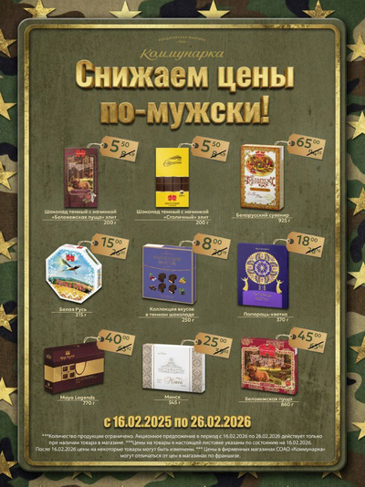 Кондитерская фабрика «Коммунарка» снижает цены по-мужски и проводит акцию к 23 февраля. В фирменных магазинах фабрики, а в Могилеве он всего один, шоколад темный с начинкой «Беловежская пуща» 200 г предлагают по 5,50 руб., столько же — шоколад «Столичный», конфеты «Белая Русь» в коробке 315 г — 15 рублей. И это не…