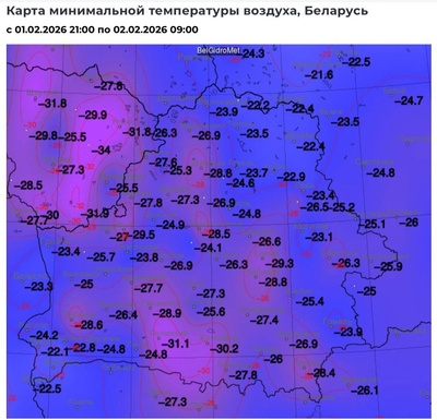 Теперь и официально: -30 есть. Белгидромет показал ночные минимумы. Рекорд на юге страны, и он составил -31,1°. В соседней Литве зафиксировали -34°. Инфографика Белгидромета В среду, как прогнозируют синоптики, теплый циклон…