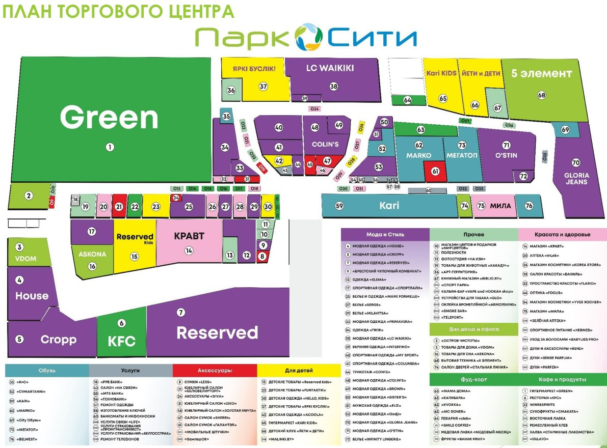 В торговом центре работает один из трех в Могилеве гипермаркетов Green, аптека, банки, мастерская по ремонту одежды, Фудкорт и детский клуб. Также в торговом центре находятся магазины товаров для дома и офиса, салоны связи, детские, ювелирные магазины и многое другое.