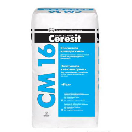 Клей «Flex» CM 16 – продукт бренда Ceresit. Смесь используется для приклеивания керамической, глазурованной, цементной и каменной плитки (кроме мрамора) на поверхность, подверженную деформации.