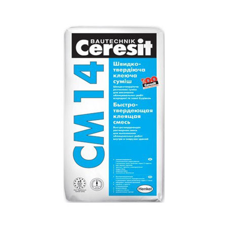 Быстросхватывающийся клей для плитки «CM 14» – продукт компании Ceresit. За счет высокой скорости набора прочности, клеящая смесь применяется для ускоренной укладки керамической и каменной облицовки при необходимости срочной сдачи объекта в эксплуатацию.
