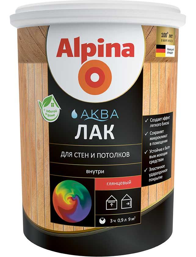 Alpina Аква — специальный лак на акриловой основе для декоративной отделки и защиты деревянных поверхностей внутри помещения. Отличается повышенной износостойкостью и эластичностью, содержит восковые добавки. Не подходит для поверхностей с высокой механической нагрузкой. После нанесения образует глянцевое покрытие стойкое к истираниям и образованию царапин и трещин. Расход составляет 100 мл/м2 на один слой гладкой поверхности. Легко очищается мыльной водой или бытовыми моющими средствами. Эксплуатация поверхности возможна через 24 часа. Возможна компьютерная колеровка в системе ColorMix в оттенки древесины. Для достижения оптимального результата рекомендуется использовать кисти с искусственной щетиной из полиэфирных волокон или валики. Объем банки — 2,5 л/2,5 кг.