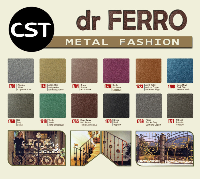 Патина Dr.Deror Предназначена для защиты и декоративной отделки, в том числе "ПОД СТАРИНУ", металлических изделий, полученных с помощью ковки, штамповки, литья из чугуна, железа, стали, цветных металлов (памятников, каминов, оград, дверей, ворот, парапетов, светильников, фонарей, ювелирных и других изделий различных форм и размеров), эксплуатируемых в атмосферных условиях и внутри помещений, в том числе в условиях повышенной влажности и перепадов температур. Патина Dr.Decor обладает повышений адгезией, атмосферо-влагостойкостью.
